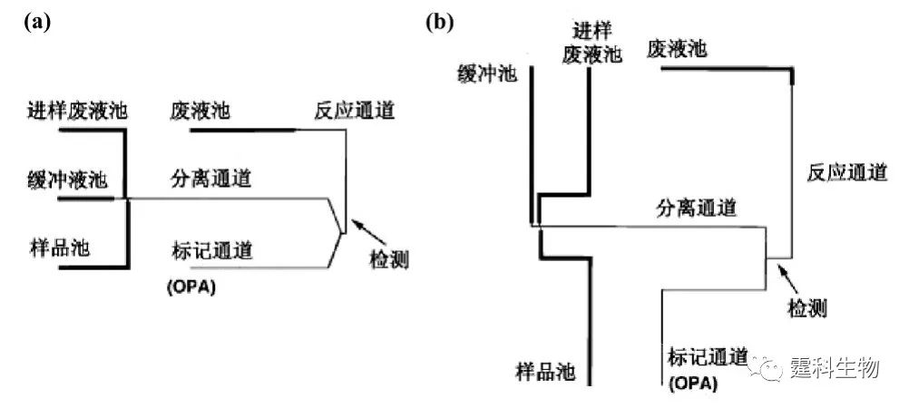 图6-27 不同设计的柱前反应和分离通道的PDMS芯片结构示意图[21] 1.样品池;2.试剂池;3.缓冲液池;4.样品废液池;5.缓冲废液池 6.7.2.2柱后反应器 柱后反应是在分离过程完成后为提高检测灵敏度而进行的在线衍生反应。不仅要求衍生反应能快速进行,也要求衍生试剂本身的背景信号低,重现性好。值得提及的是柱后衍生反应在分离和检测过程间进行,时间非常短,所以不要求反应进行非常完全,也不要求衍生物非常稳定。图6-28是柱后反应的一个示例[22]。在T形通道(分离通道长7 mm,反应通道长10.8 mm)的微流控芯片上,对精氨酸、苏氨酸、谷氨酸先行分离,然后与邻苯二醛进行柱后衍生。其理论塔板数数分别为每米1300、2460、329,柱效很低。究其原因可能是①衍生试剂与样品溶液汇合时,破坏了原来液体的流型,造成了谱带的展宽;②因为通道比较短,电渗流较高,可供进行衍生反应的时间非常短,反应不完全,溶液中的组成可能比较复杂,既有和衍生剂结合的衍生产物,又有未结合的自由氨基酸,这些组分在电场力作用下的迁移速度不同,分离也不完善,也导致了谱带的展宽。