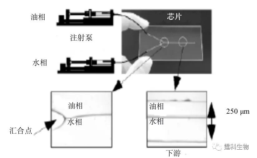 图6-22 用于多组分缩合反应的微反应器芯片与ESI-MS联用示意图[16] 6.7.1.2非均相反应器 非均相反应器是指反应体系中存在着不止一个相的反应器,通常包括两相或三相。常见的有液-液、气-液、气-液-固等反应器。由于反应物之间有相界面,非均相反应较均相反应更为复杂。 1.液-液非均相反应器 非均相液相反应器中,有机相和水相由各自的通道进入共同的通道,形成有界面的两相液流。在这种情况下相接触、扩散分布和反应都发生在界面上。同时作为一种微流控反应系统,流体的雷诺数很低,所以它的混合主要依靠扩散而不是对流。图6-23是液-液相非均相微反应器的一个示例[17]。