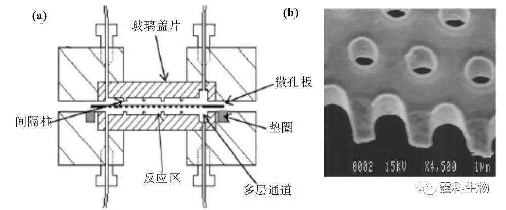 图6-23 液-液相非均相微反应器示例[17] 该微反应器宽250 μm,深100 μm,长3 cm,它的接触面积很大,水溶的4-四氟化硼偶氮硝基苯和溶解在醋酸乙烷中的6-甲基间苯二酚进行反应,在这种微流体系中,当线性流速达1.3 cm /s时,其转化效率接近100% 目前,利用不连续的液滴作为液-液非均相反应器的报道也较多,详细内容见第8章。 2.气-液非均相反应器 气-液微反应系统需要有高效的方法分散液流中的气体,增大反应物的接触面积,以满足合成或分析的要求。 图6-24所示的网筛式微反应器[18]可同时用于气-液相和气-液-固相微反应中。这种反应器芯片由三层结构构成,上、下层均为玻璃盖片,中间层用电化学方法在底板上沉积镍和铜,形成直径1-5 μm,深100 μm的孔穴。孔穴上方腔室里充满反应气体,其他部分充满反应液体。在孔穴附近的表面,其气液接触的面积体积比能达到2000 m2/m3,远高于普通槽式反应器的100-300 m2/m3,大大增加了反应的传质传热效率。在此反应器上可进行气-液相的以Pd/Al2O3 为催化剂的α-甲基苯乙烯加氢反应。