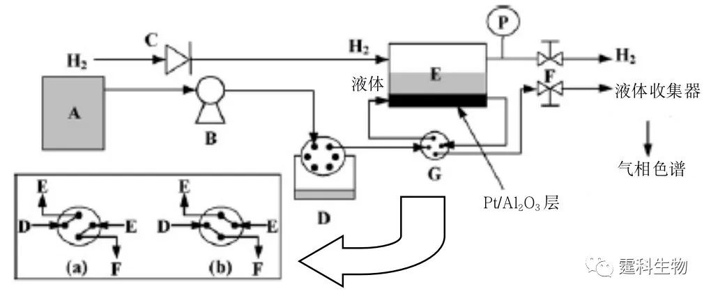 图6-24 网筛式气-液相微反应器[18] (a) 图为网筛式微反应器的芯片示意图;(b) 图为网筛式微反应器的扫描电子显微镜照片 3.气-液-固多相非均相反应器 在气-液-固多相反应器中,除了把气体分散到液相中并保持被分散相的稳定性外,还要在尽量减少通道压降的情况下,增大固体的比表面积及固体和气液两相的总接触面积。 图6-25是气-液-固非均相微反应器的一个示例[19]。液池(A)中的酶反应底物和配体均经过高效液相色谱泵(B)泵入一个带有环形回路的注射阀(D),经四通阀(G)后,进入微反应器(E)。气体流量表(C)用于控制氢气流。针形阀(F)在微反应器后方调节压力,使得气体和液体在出口处压力适中,(P)为压力传感器。当微反应器(E)和液体注射阀(D)之间的四通阀(G)处于不同位置时,分别代表连续或关闭的不同状态。在网筛式微反应器孔穴上方为气体,下方为液体,固相催化剂Pt/Al2O3沉积在底部与液体接触,而不直接接触气体。该微反应器的气/液传质系数可达1-2/s,反应产物收集后经气相色谱检测。利用该反应器实现了高氢压力下(45 Pa)以Pt/Al2O3为催化剂的丙酮酸盐不对称加氢反应,反应体积仅为100 µL,操作时间很短。