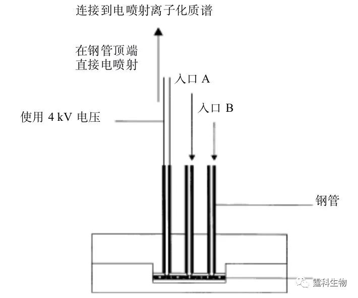 图6-21 均相液相微反应器[3] (a) 微反应器结构示意图:经过反应器前端的3D交互式的并行迭片微混合器后,液流A和B混合形成多股不均匀液流,经过后面连接的一条长折叠通道,进一步扩散、反应,最后在较为宽阔的出口处聚集成均匀的液流。整个芯片大小仅有5 mm×1 cm,内部体积仅有600 nL,液流流速范围为1~200 μL/min,可在短时间内(15 ms)达到较高的混合效率(95%);(b) 液流A(荧光素)与液流B(罗丹明B)混合的实物图 由于微流控芯片系统中液流速度与电喷射离子化质谱(ESI-MS)所要求的流速相匹配(nL–μL/min),所以芯片可与质谱联用,实时在线检测反应的中间产物,这在制药工业中具有重大意义。图6-22是芯片与质谱联用进行多组分缩合反应并实时检测中间产物的一个示例[16]。在体系中,芯片采用玻璃-硅-玻璃三层结构,中间为结构如图6-21所示的并行迭片微混合器。两入口和出口均由钢管与芯片相连,出口处钢管顶部连有电喷射离子化质谱(ESI-MS)。在室温下,盐酸哌啶、甲醛、环己异氰酸三种不同原料溶解在甲酸中从A入口加入,甲酸溶剂从B入口加入,两液流在微混合器中充分混合,通过多步反应,最后成功合成α-二烃基乙酰胺,反应物和中间体(环己基氨基氯化物)用ESI-MS实时在线检测。对于上述剧烈产热合成反应,微流控系统具有热传导快的优点,无需额外增加散热装置,即可在常温下进行反应。通过缩小反应规模、增加反应数目,可获得与常规反应相同的产量,而危险性大大降低。