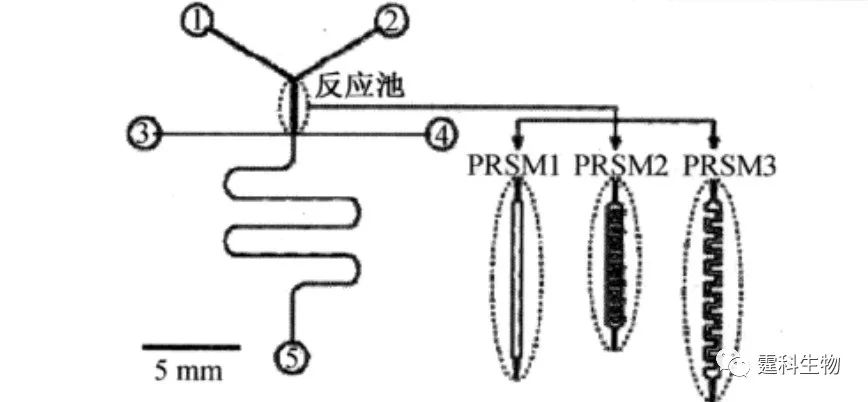 图6-26 柱前反应器芯片示意图[20] 反应室长2 mm,分离通道长15.4 mm 柱前反应器可以有不同的设计方式。为了提高混合效率,比较了三种体积均为4.5 nL但样式不同的反应器,如图6-27所示[21]。试样溶液组胺酸、酪胺酸、腐胺酸、色胺酸和衍生试剂邻苯二醛(OPA)在稳定的电渗流下被输送到反应池,实验证明第三种的混合/反应效率最高。该PDMS芯片经冠状化合物不可逆封接,在优化了SDS浓度、pH值和电渗流的稳定性等条件后利用胶束毛细管电泳进行在线检测,可获得和传统玻璃芯片上相同的分离检测效果。